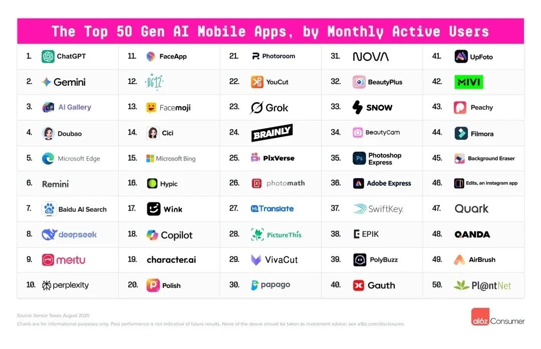 与之对比,全球AI应用市场上,众多细分赛道则相对活跃。从A16Z最新发布的一份《全球百强AI消费者应用榜单》第五版可见,除了几个“老面孔”覆盖了几乎所有高频场景—学习、陪伴、设计、生产力、社区,作为“黑马”的几款产品来自不同的领域。比如主打氛围编程的Lovable 直接冲到第 22 位,Suno首次把音乐生成带入主榜。