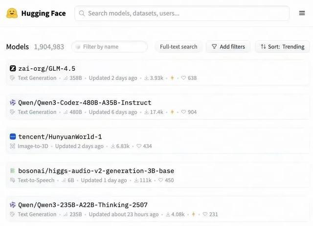 2025 年 7 月 30 日,在 Hugging Face 的开源模型榜单前 10 名中有 9 个来自于中国,这 9 个大模型分别属于智谱、阿里通义、腾讯混元、月之暗面;就这一榜单的前 5 名来说,当时除了第 4 名,其余几名全部是中国大模型。其中,智谱 AI 的开源模型 GLM-4.5 模型发布之后迅速冲上榜单前列,而这款模型正是前面提到的郁家豪所使用的国产大模型。