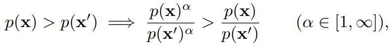 那么对 p 取幂会增加高似然度序列 (x) 的相对权重,同时减少低似然度序列 (x') 的相对权重。下图给出了可视化演示: