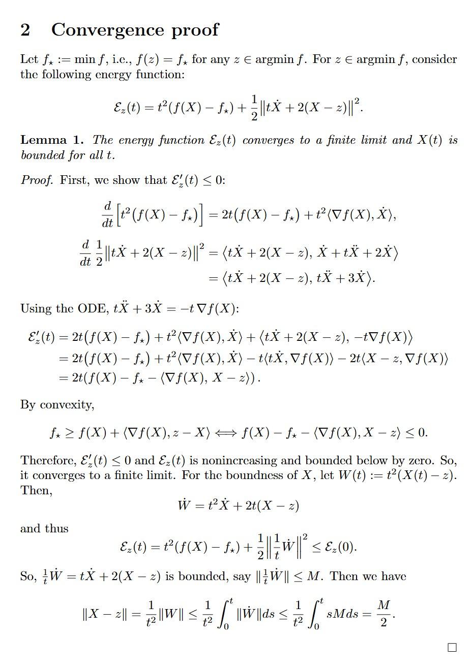 这个数学问题探讨的是一个在最优化理论中非常著名的动态系统,我们可以用一个生动的物理比喻来理解它:一个球在碗里的滚动过程。在这个比喻中,被称为「凸函数」的 f 就代表一个形状完美的碗,它内部光滑,从碗边到碗底的坡度是逐渐下降的,没有任何凹陷或小山丘。这个碗的碗底可能是一个尖锐的点,也可能是一片宽广的平坦区域,这片最低的区域在数学上被称为 argmin f。而 X (t) 则描述了在时间 t 时,一个球在这个碗中所处的位置。截图中的那个核心微分方程,Ẍ(t) + (3/t)Ẋ(t) + ∇f (X (t)) = 0,就是控制这个球如何滚动的「物理定律」。其中,∇f (X (t)) 扮演了「重力」的角色,时刻将球往坡度最陡峭的下方拉扯;而 (3/t)Ẋ(t) 则是一个非常特殊的「摩擦力」,它的奇特之处在于会随着时间的流逝而逐渐减弱。一开始摩擦力很强,能有效减速,但随着时间 t 变得越来越大,这个摩擦效应会变得越来越微弱。整个问题就是从碗壁的某个初始位置 X₀ 将球从静止状态释放,然后观察它在这套独特的物理规则下将如何运动。