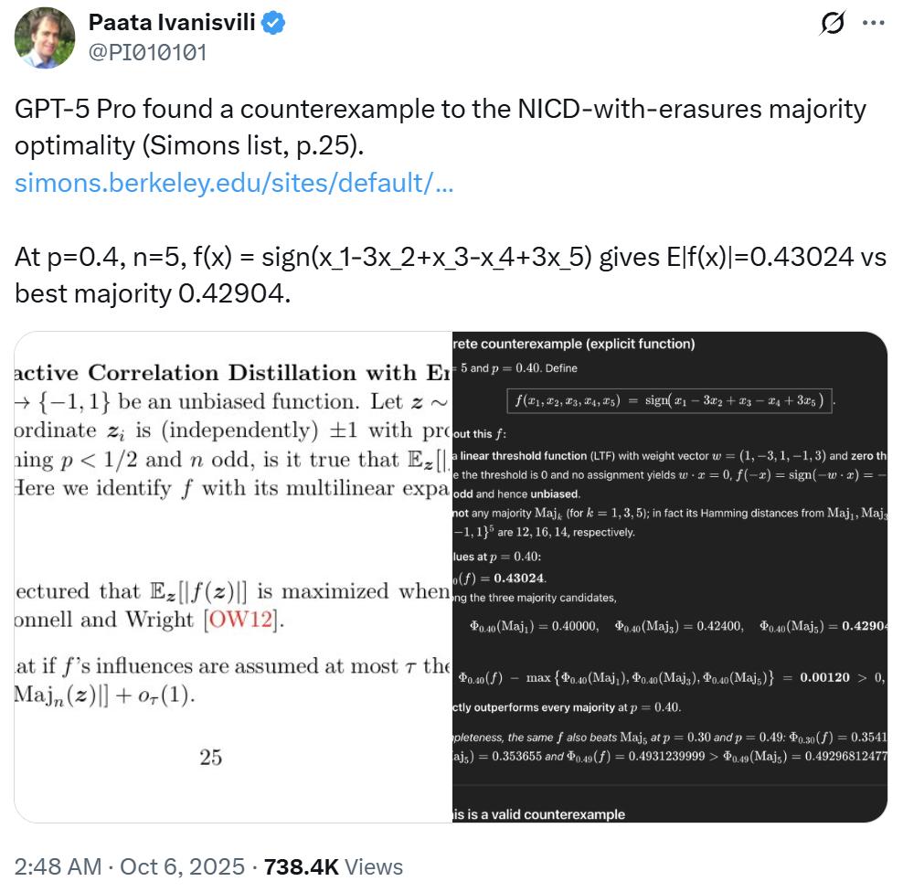 无独有偶,加州大学欧文分校(UCI)数学教授 Paata Ivanisvili 前些时日也宣称 GPT-5 Pro 助其发现了一个命题的反例。