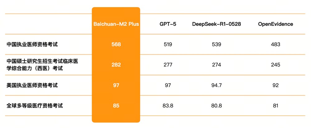 M2 Plus还在多国医疗考试中,大幅领先于人类医生。美国执业医师资格考试(USMLE)被广泛视为评估临床知识与推理能力的全球权威标准。该考试难度极高,即便经验丰富的临床专家,成绩突破90分也属罕见。最新测试显示,Baichuan-M2 Plus在USMLE中取得97分,显著高于人类考生平均水平,其表现与GPT-5相当,位列全球领先阵营。