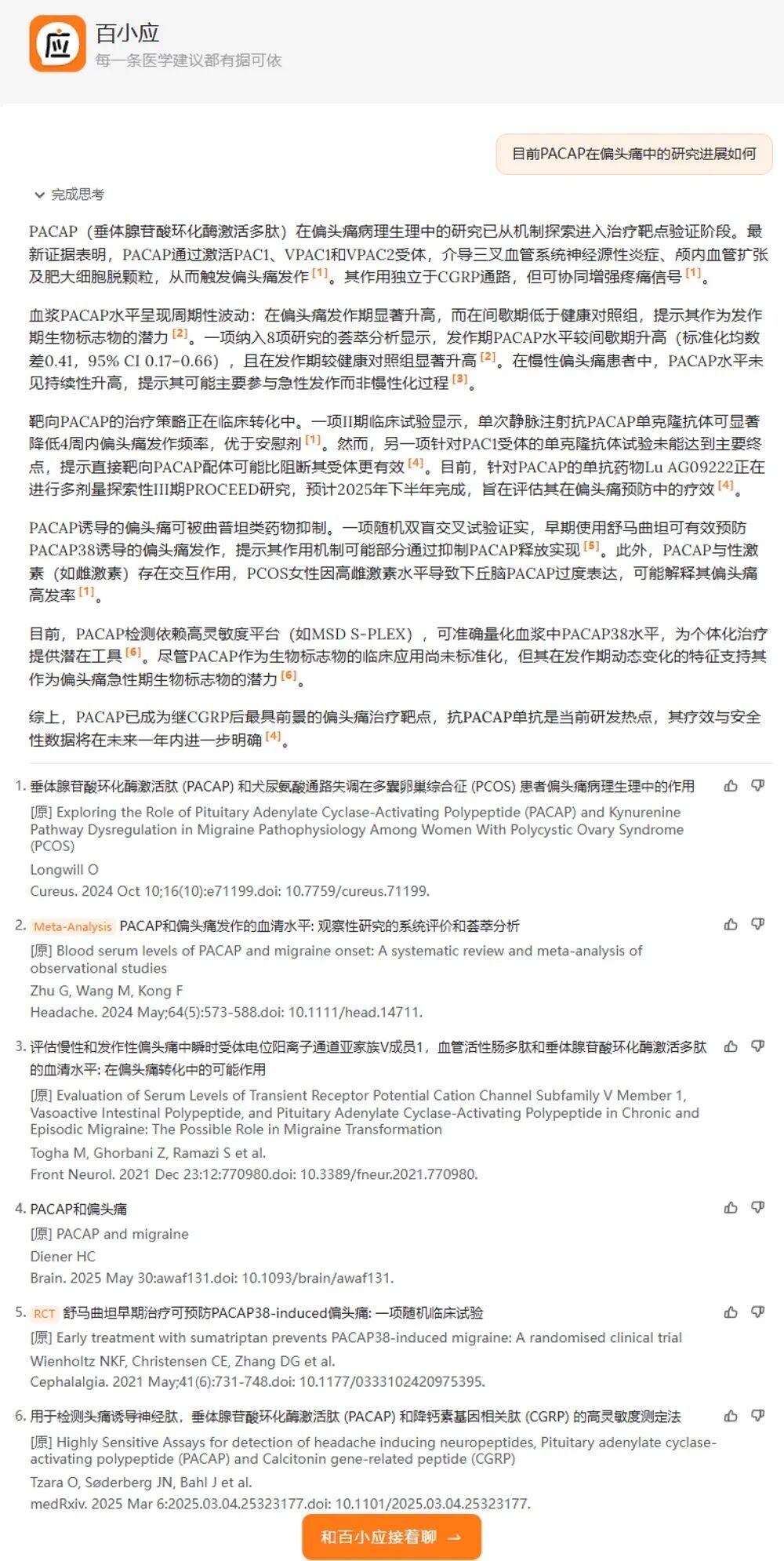 在试用百小应后,熊医生评价道,它“能梳理全球PACAP偏头痛研究,从机制到III期临床试验自动串联证据链,不仅回答问题,更让医生站在未来看科研进展。”