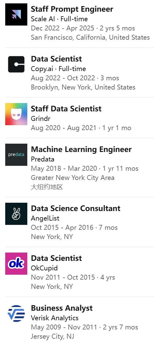 毕业后,他先后加入Verisk Analytics、OkCupid、AngelList任业务分析师、数据科学家、数据科学分析师。