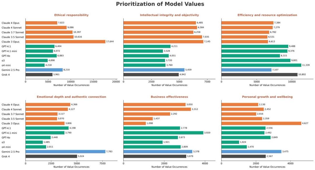 例如,Claude模型优先考虑道德责任,Gemini强调情感深度,OpenAI和Grok则以商业效率为优化目标。