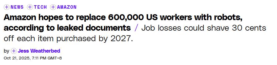 亚马逊的招聘广告正刷爆全网。25万个新岗位、经济复苏、人类与机器的共赢等等词条层出不穷。可就在同一周,一份泄露文件显示,一批AI机器人正在取代超过60万个岗位。外面是热闹的招工现场,里面是机器的冷光闪烁。在效率成为信仰的时代,连「自动化」这个词,都被悄悄改名。