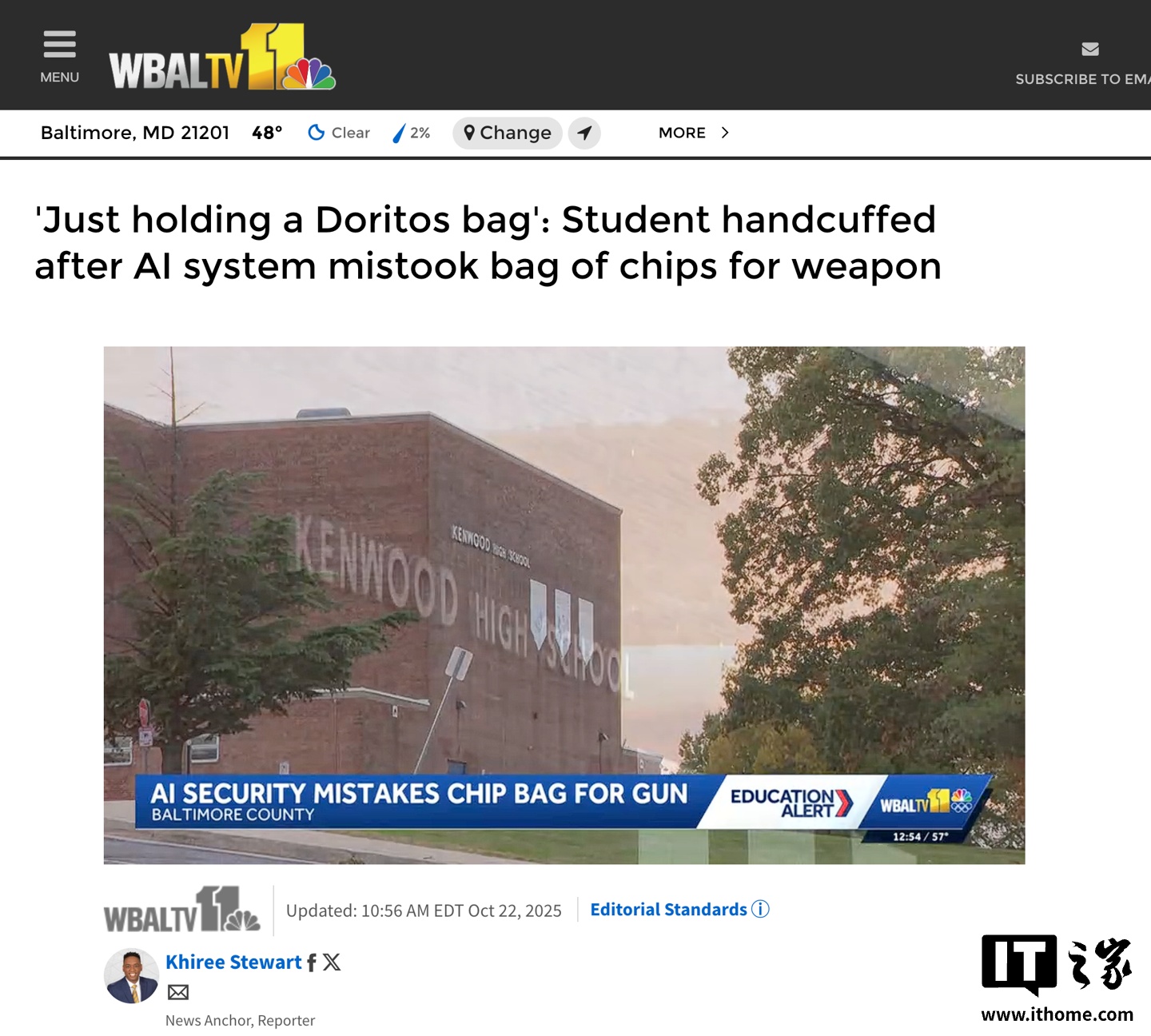 IT之家 10 月 25 日消息,据美国 WBALTV 22 日报道,美国一所学校的 AI 系统误将一名高中生手里的多力多滋薯片识别为枪支,并向当地警方报警称学生持有武器。