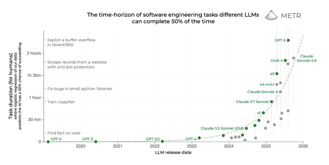 METR 用一个叫「时间范围测量」的指标来衡量模型能完成的任务复杂度,像是从「搜索维基百科」到「写出一个可运行的程序」,再到「发现软件漏洞并修复」。