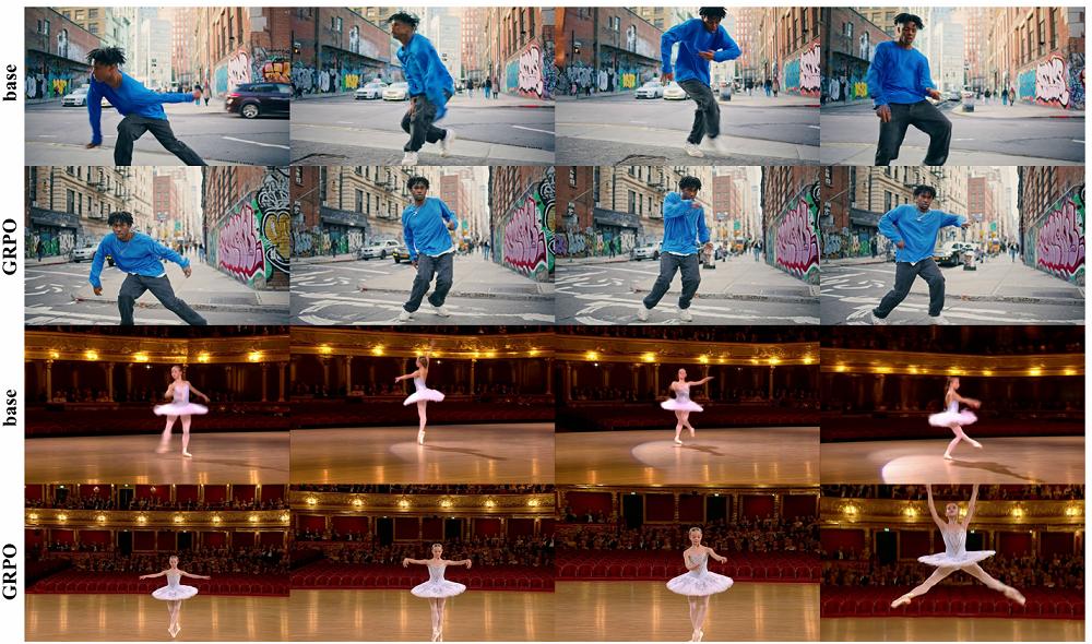 ▲LongCat-Video采用的GRPO方法与基线的生成效果对比