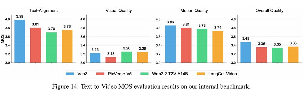 在运动质量方面,LongCat-Video生成的视频动作流畅、镜头移动自然,展现出较强的物理合理性。在文本对齐度上,LongCat-Video表现略差于Veo3。