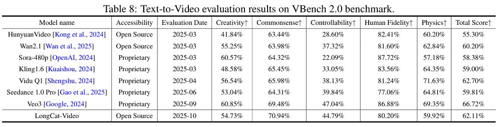 在公开评测平台VBench 2.0上,LongCat-Video在“常识理解”一项中以70.94%的得分位居所有开源模型第一,总分达到62.11%,仅次于谷歌Veo 3与生数Vidu Q1等商用闭源模型。