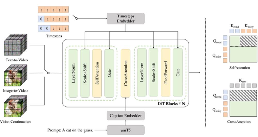 在输入数据层面,美团团队借助WAN2.1模型的VAE将视频像素压缩成潜空间token,使视频数据能以更紧凑的形式参与建模,整体压缩率高达4×16×16倍;文本输入则由umT5多语言编码器处理,支持中英文双语,进一步提升了模型的通用性。