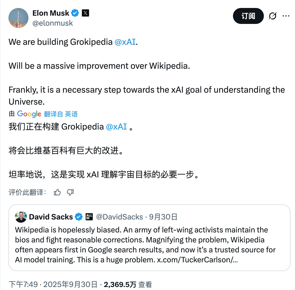 马斯克宣称,Grokipedia是一个比著名百科平台维基百科拥有更少偏见的替代方案。今年9月底,马斯克曾在X上表示:“我们正在由@xAI 团队构建Grokipedia。和维基百科相比,它将有巨大的改进。坦率地说,这是xAI实现理解宇宙这一目标的必要一步。”