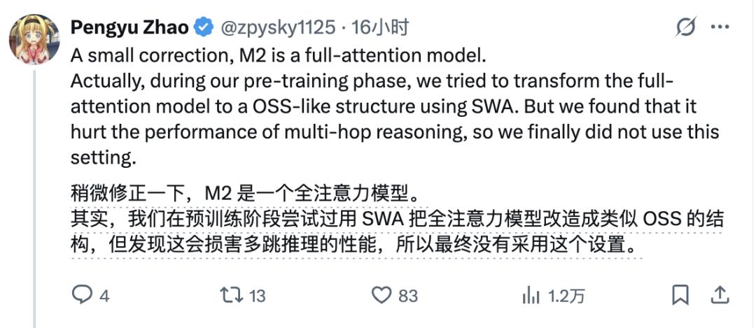 不过Minimax NLP负责人指正,表示一开始确实想在预训练阶段引入SWA,但发现会造成性能损失,所以最后使用的是全注意力。