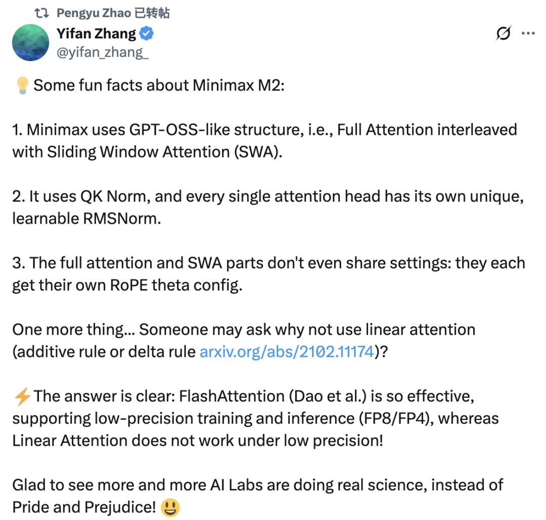 有网友从vllm的代码当中看出了M2的更多技术细节,表示M2采用类似GPT-OSS的全注意力和滑动窗口注意力(SWA)的混合机制,