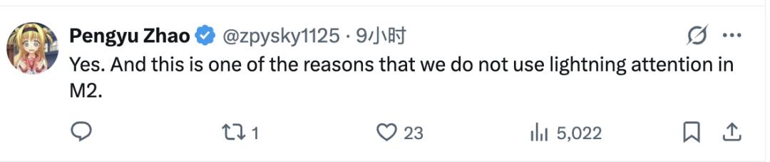 同时,M2也没有采用Lightning Attention(线性注意力的一种变体),原因也是因为性能损失。