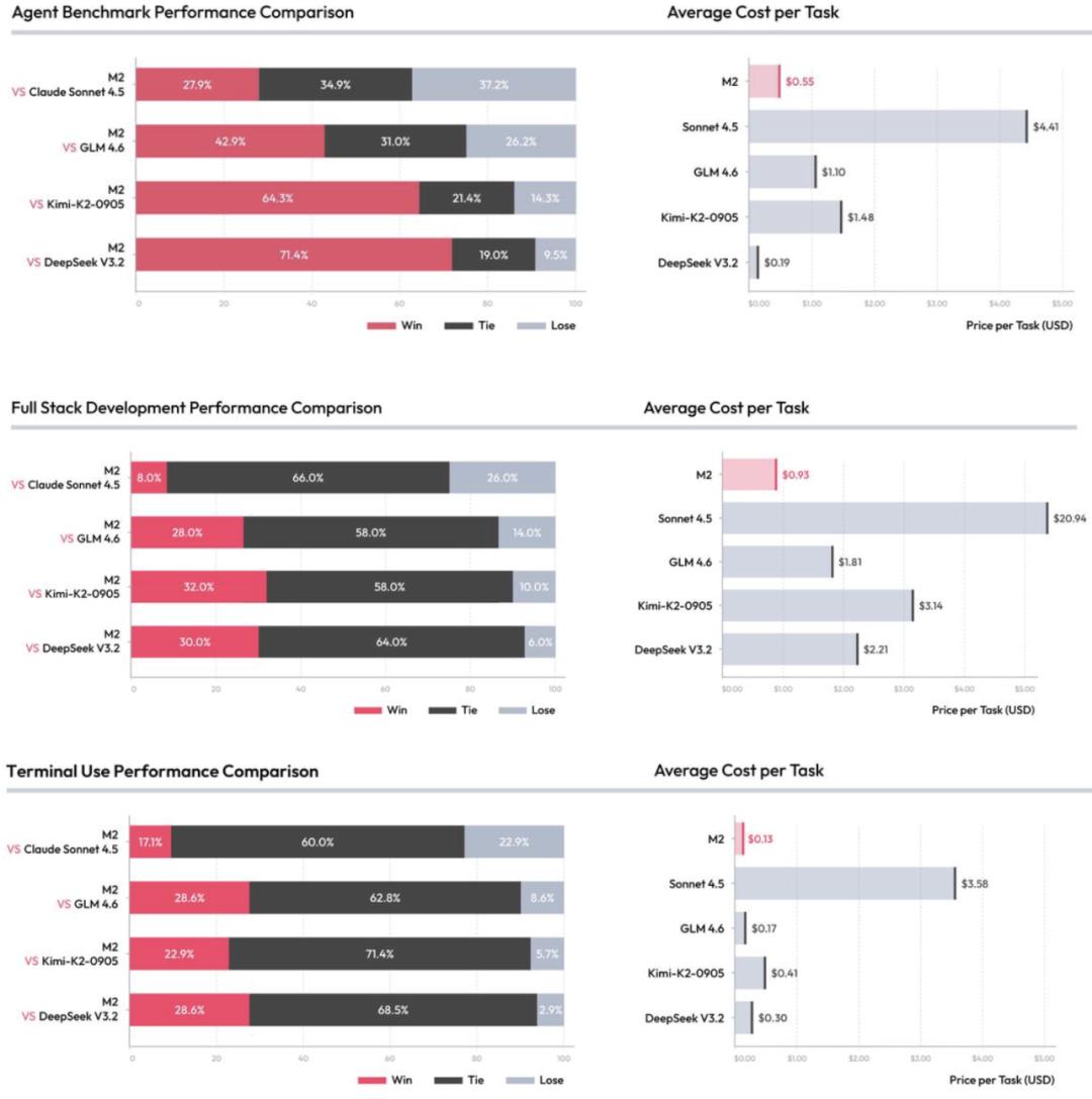 结果M2相比于Claude Sonnet 4.5、GLM 4.6、Kimi-K2以及DeepSeek V3.2均有极高的Win+Tie比例,同时成本非常低廉。