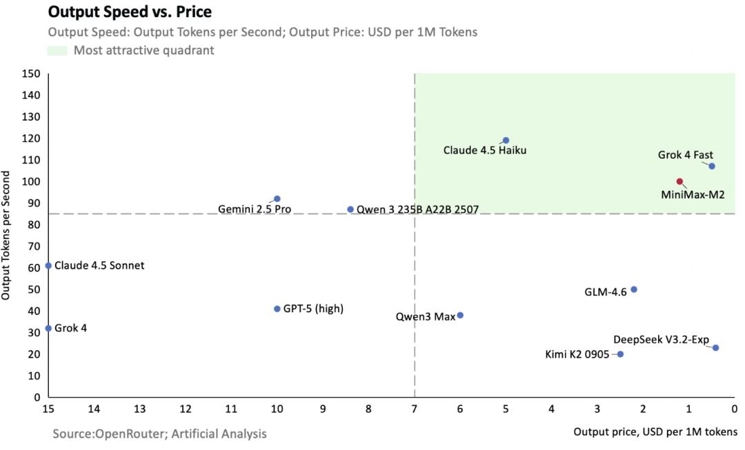 以Artificial Analysis的成绩为基准,Minimax绘制了一张图来比较各大模型性价比(横轴越向右成本越低)。
