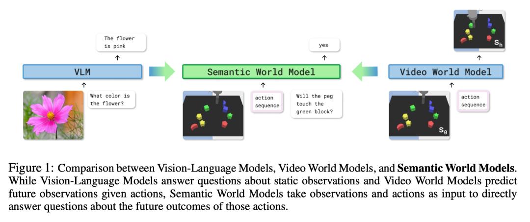 为此,新论文提出了「语义世界模型(Semantic World Model, SWM)」的概念。SVM 是一种具备泛化能力的世界模型,它以动作条件的视觉语言模型形式存在,能够回答关于未来动作语义效果的问题。