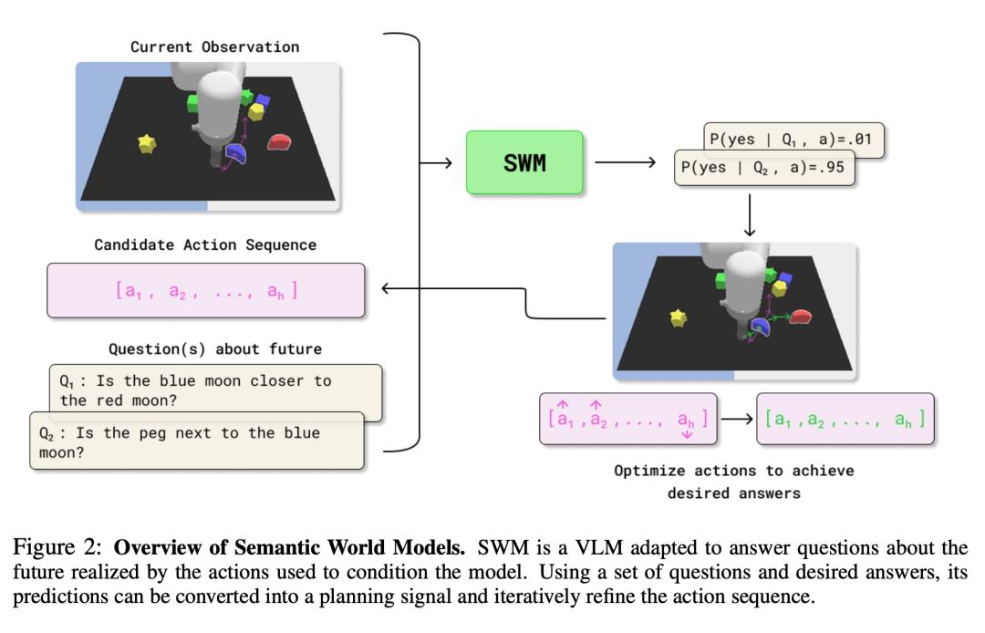 下图 2 展示了语义世界模型的概况。SWM 是一种视觉语言模型,经过调整后能够回答与未来相关的问题,这些问题由用于调整模型的动作所决定。通过一系列问题和期望的答案,其预测可以转化为规划信号,并迭代优化动作序列。