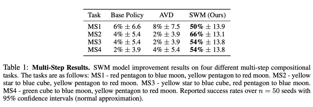 SWM 还通过先选择子目标,再围绕该子目标进行规划,展现出处理更长程任务的能力。如表 1 所示,在多步任务上,SWM 的平均策略改进幅度达 52.0%,优于 AVD 基线。