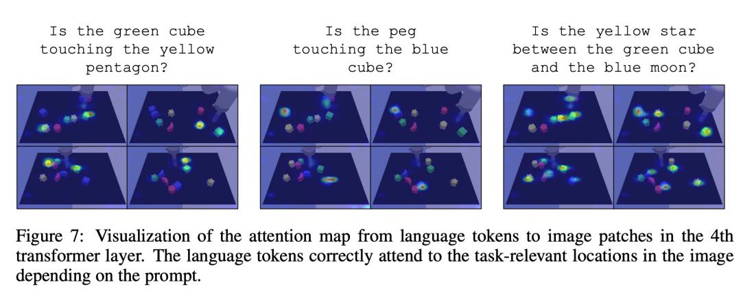 为了理解模型所学的表征,作者从模型的一个中间层可视化了从语言 token 到图像 patch 的注意力图。如图 7 所示,模型会根据语言提示正确关注图像中与任务相关的位置。例如,当被问到「红色的月亮是否在接触蓝色的立方体?」时,与这些物体对应的图像 patch 上的注意力得分更高。尽管从未在涉及两个以上物体的问题上进行过微调,但研究发现,当被问及此类问题时,该模型能够正确关注三个物体。这表明该模型继承了预训练 VLM 的泛化能力。