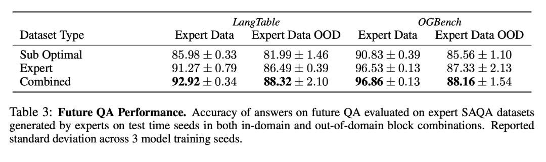 从表 3 可以看出,混入次优数据比仅使用专家数据进行训练能提高准确率。SWM 仅通过次优数据训练也能达到中等水平的性能,这表明次优数据在训练语义世界模型方面是多么有效。