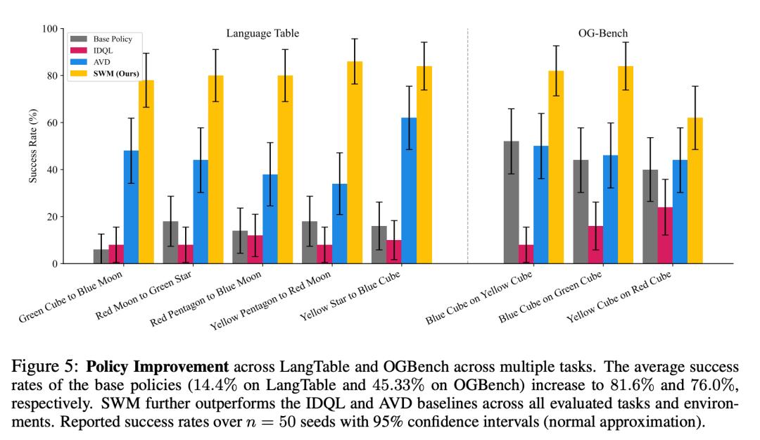 然而,对于大型模型而言,基于采样的规划方法计算成本高昂,在需要更多样本的更具挑战性的任务上运行 MPPI 并不可行。因此,对于更复杂的任务,考虑这样一种场景:由一个基础策略生成候选轨迹,再利用 SWM 和基于梯度的优化对其进行细化。如图 5 所示,该方法能够对候选轨迹进行细化,并相比基础策略取得显著提升。在 LangTable 上,SWM 相比基础策略的平均性能从 14.4% 提升至 81.6%;在 OGBench 上,从 45.33% 提升至 76%。SWM 在所有任务上也均优于 AVD 和 IDQL 基线,展示了其在规划方面的有效性。