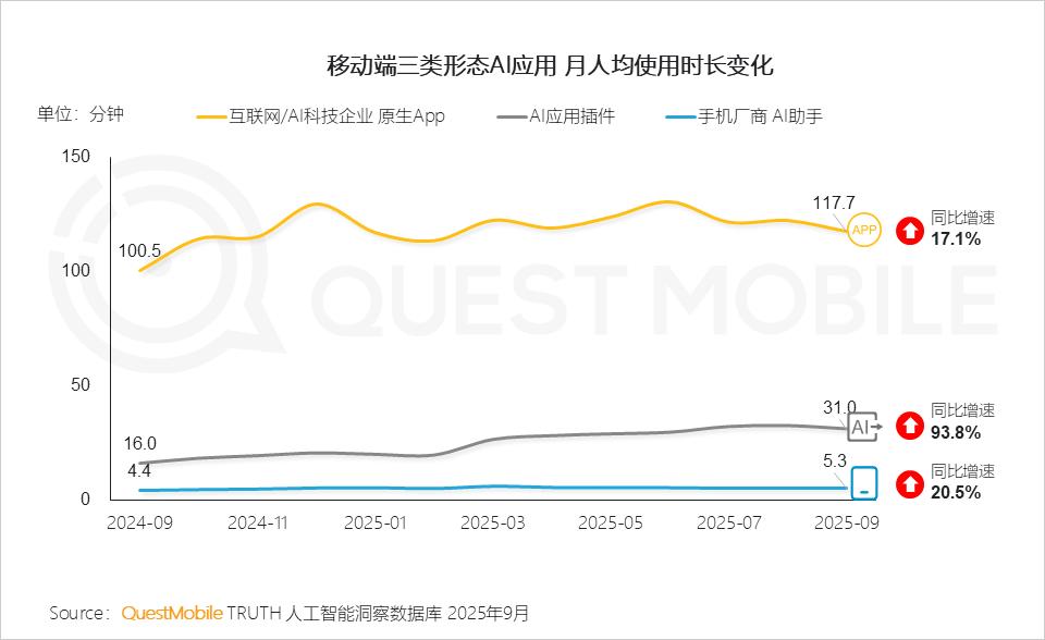 5、 QuestMobile数据显示,2025年9月,移动端三类形态AI应用月人均使用时长均实现显著提升