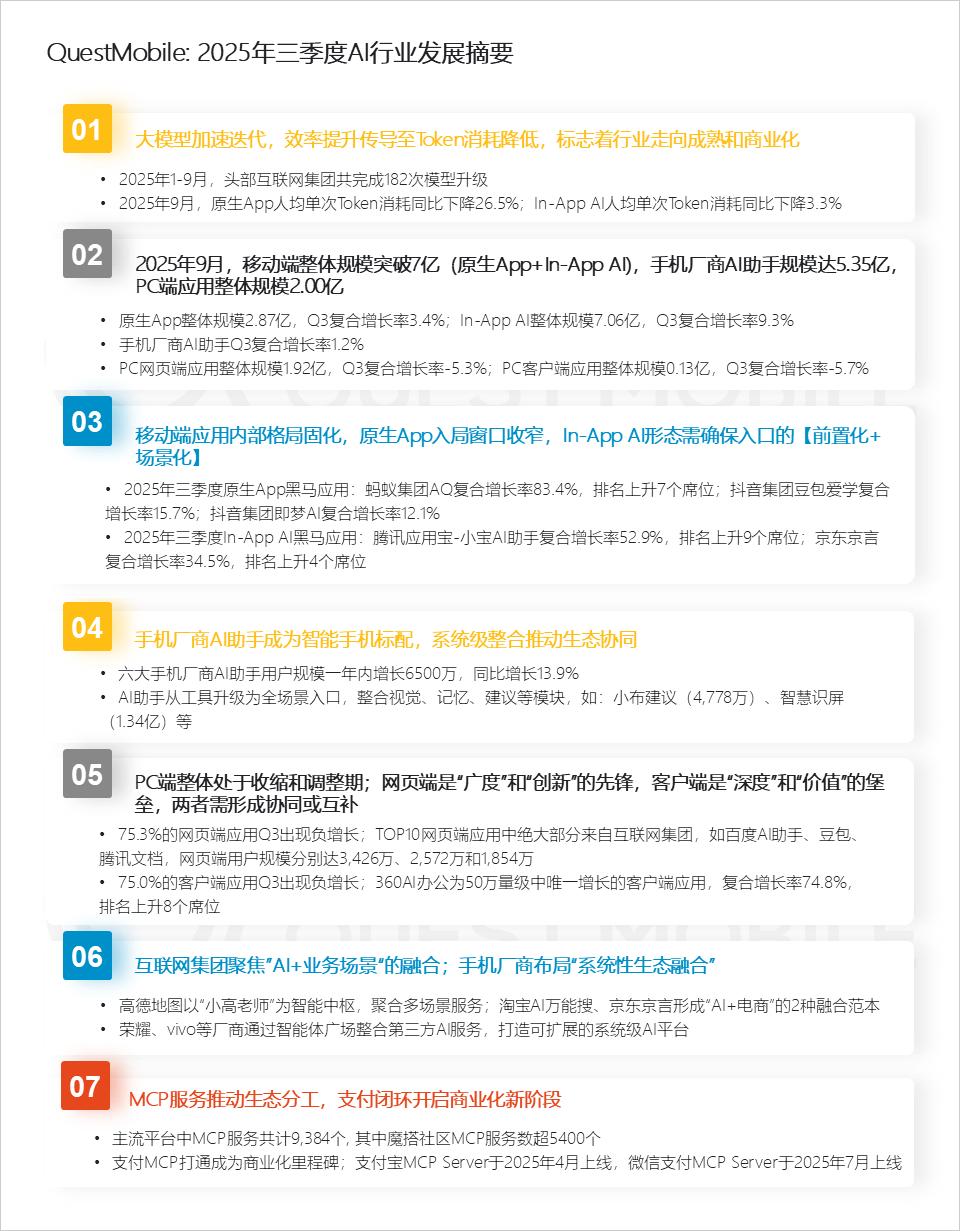 2、2025年9月,移动端整体规模突破7亿(原生App+In-App AI),手机厂商AI助手规模达5.35亿,PC端应用整体规模2.00亿