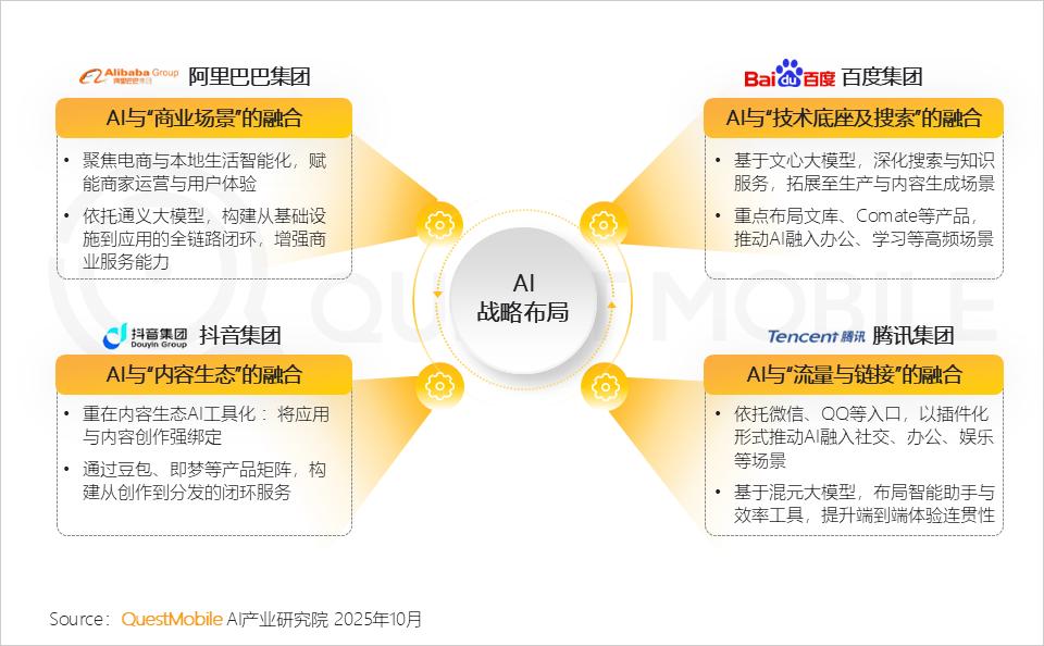 1、互联网企业的AI战略是回归业务场景的融合,将AI作为“倍增器”进行的深度融合,旨在加固主业护城河并孵化新增长曲线