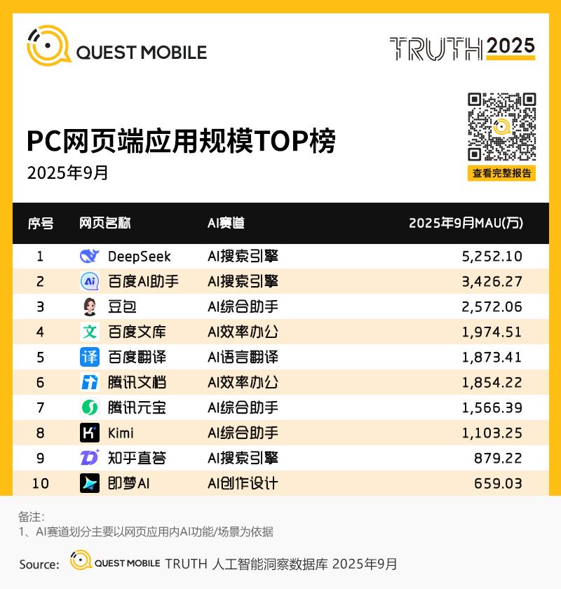QuestMobile数据显示,2025年9月,绝大部分TOP10 PC端网页应用来自头部互联网集团,如百度、抖音、腾讯;百度AI助手、豆包、腾讯文档网页端用户规模分别达3,426万、2,572万和1,854万。