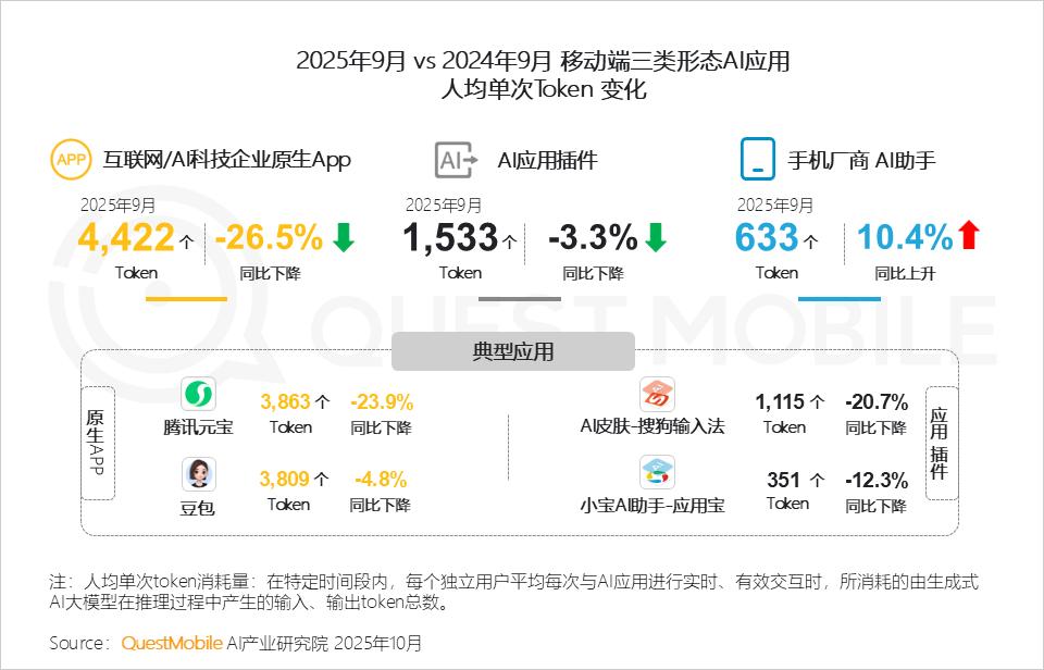 QuestMobile数据显示,2025年9月,原生App、In-App AI及手机厂商AI助手,用户规模分别达2.87亿、7.06亿和5.35亿。