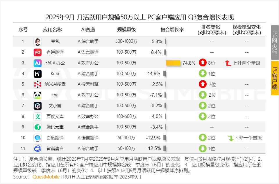 QuestMobile数据显示,三季度内,75.0%的客户端应用出现负增长,10万以下客户端出现部分增长,但500-1000万体量客户端集体下滑,可能与功能迭代缓慢、用户体验同质化,或难以适应快速变化的AI需求有关。