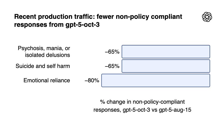 而对比 8 月份的 GPT-5,不符合OpenAI 分类标准的行为响应率,在最近的生产行为中降低了 65% 到 80% 流量。