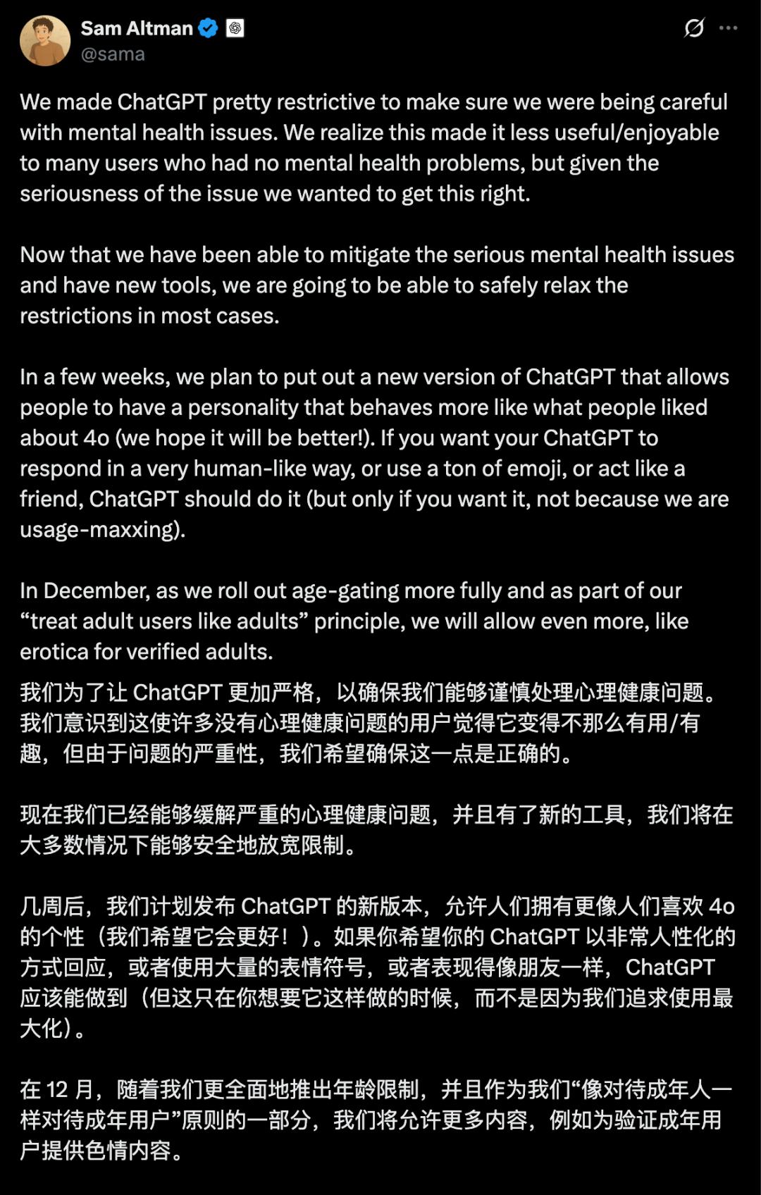 奥特曼在两周前,也已经预告了 ChatGPT 关于心理健康的更新,来平息这些关于 OpenAI 不负责、不安全的言论。