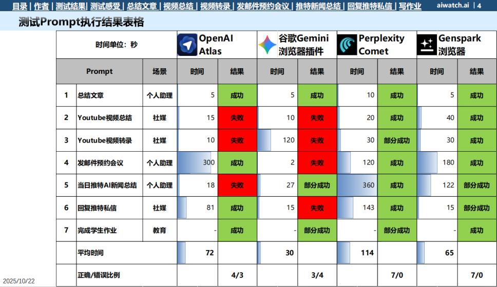 根据自媒体博主郎瀚威于2025年10月22日发布的测试报告,在对文本总结、视频总结、邮件处理及社交媒体相关等用户高频任务进行测试时,Atlas虽能完成基础操作,但在面对稍复杂的任务时成功率明显下降。