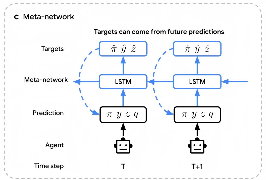 相应地,该团队的 RL 规则使用一个元网络(图 1c)作为函数,来决定智能体应将其预测和策略更新至的目标。为了在时间步 t 产生目标,该元网络会接收从时间步 t 到 t+n 的一段轨迹作为输入,这段轨迹包含了智能体的预测、策略、奖励以及回合是否终止的信息。它使用一个标准的 LSTM 来处理这些输入,当然也可以使用其他架构。