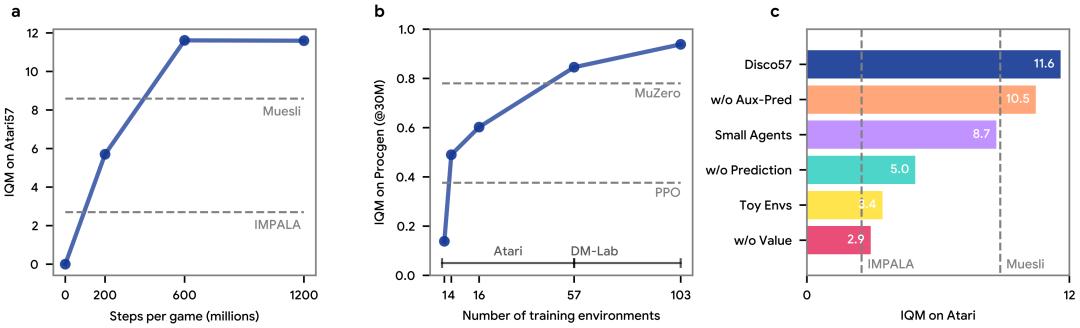 为了观察直接从该基准中发现的规则能有多强大,该团队元训练 (meta-trained) 了一个 RL 规则,命名为 Disco57,并在同样的 57 款游戏上对其进行了评估(见下图 a)。