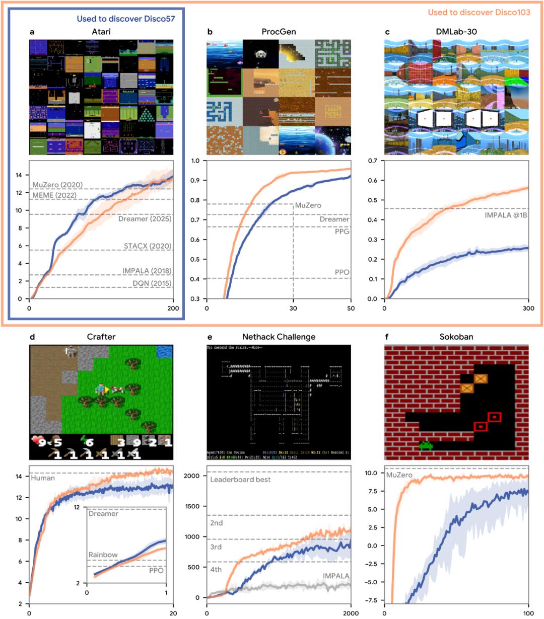 该团队还进行了大规模实验,结果发现这一「自动发现的规则」在经典的 Atari 基准测试上超越了所有现有方法,并且在若干它从未见过的高难度基准测试上也优于多种 SOTA 强化学习算法。