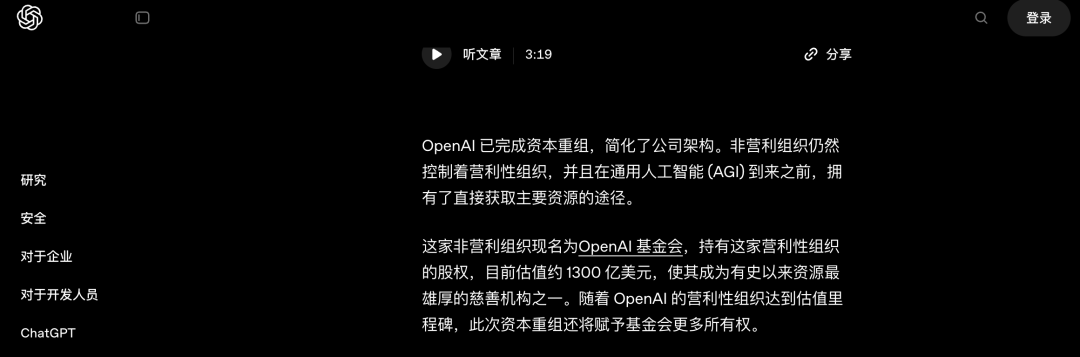 整体来看,OpenAI 对内已展现出对产品路线、收入模式与商业闭环的成熟思考;对外已经对AI 融入社会的复杂命题,展开了多元化的探索。此次重组大戏顺利收官,不仅清除了一些旧有障碍,更将其转化为了公司未来发展的核心优势。