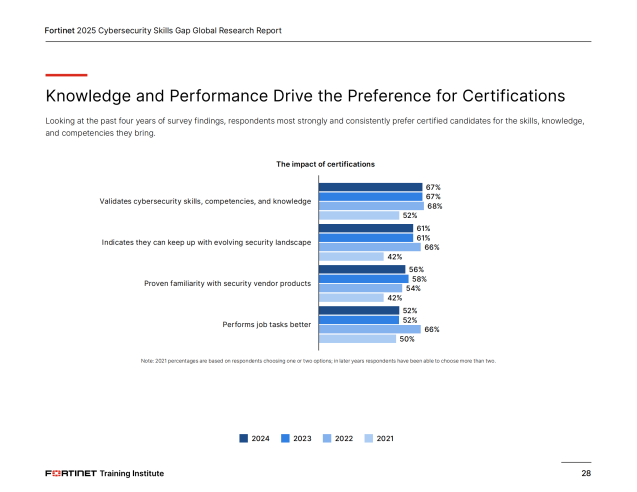 面对持续存在的人才短缺困境,专业认证的价值持续获得业界认可。89%的IT决策者更倾向于雇用持有专业认证的候选人,认为认证能有效验证知识储备(67%)、体现技术适应能力(61%)并证实对关键工具的熟练度(56%)。然而,与此趋势相悖的是,企业对认证资助的投入在2024年出现缩减,仅有73%的受访者表示愿意为员工支付认证费用,低于2023年的89%。