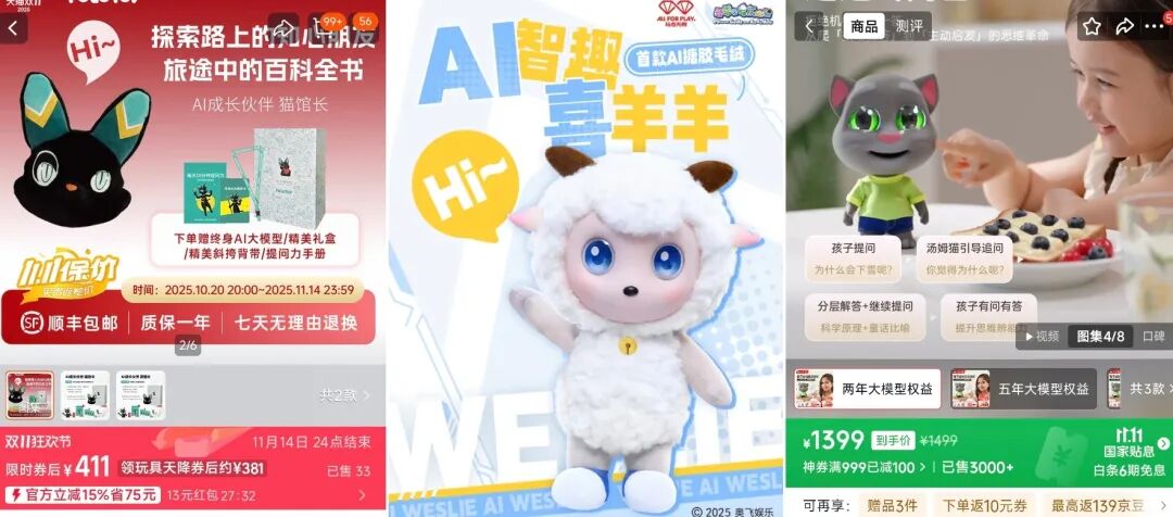 此外,汤姆猫公司于去年12月推出的“汤姆猫AI童伴机器人以及奥飞推出的AI智趣喜羊羊也有相对不错的销售表现,其中前者在三大平台总销量约6000台,由于单价高达1387-1989元,总销售额约有1000万元;后者则在上市首月售出1.2万台,总销售额超400万元。