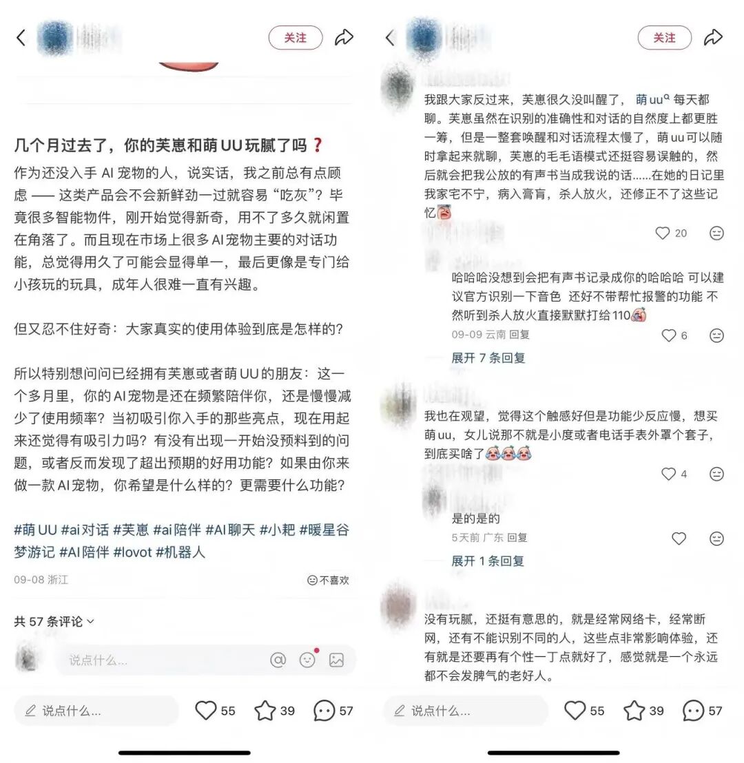 不过,相较于需求更侧重“早教工具属性”的儿童赛道,将目标用户锚定成年女性群体的 这类AI玩具,需要满足更深层次的情感诉求,并面对更为严苛的体验审视标准。因此,这类产品在消费者层面的负面反馈也相对突出。
