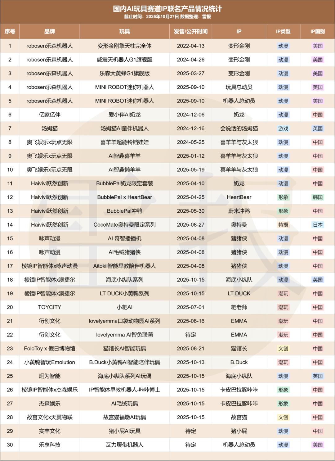 尤其值得注意的是,AI玩具行业当前已进入与IP深度融合的全新发展阶段,这一趋势在今年表现得尤为明显。据雷报不完全统计,截至当前,市场上已有至少30款IP联动型AI玩具上线或官宣,其中25款来自2025年,占比超83%,且IP类型覆盖动漫、潮玩、形象、文创、特摄等多元领域。在技术同质化尚未打破的行业初期,“卷IP”已成为品牌快速建立差异化认知、降低用户教育成本、抢占心智的核心竞争策略之一。
