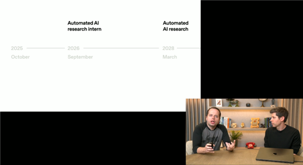 他们公布了一张路线图,他们的目标是,在 2026 年实现“AI 研究实习生”,意思是这个AI的研究能力,能去OpenAI里当实习生。2028 年,会实现全自动 AI 研究员,意思是这个AI,已经能独立研究科研项目了。