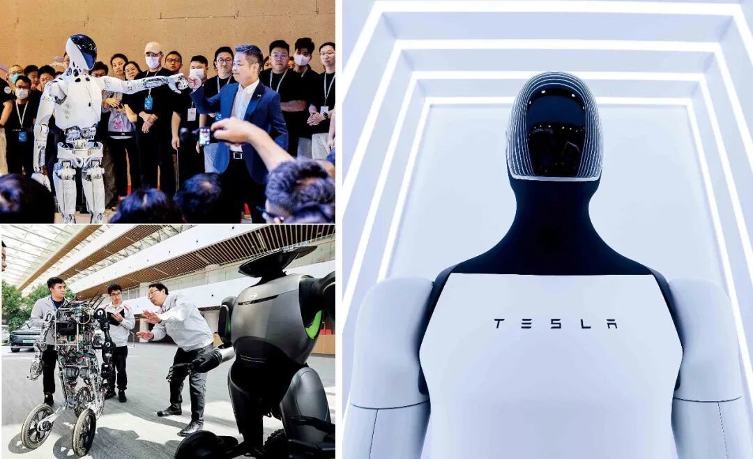 左上图:4月23日,2025上海车展期间,小鹏汽车董事长、CEO何小鹏与小鹏AI机器人IRON击拳互动。图/视觉中国 左下图:2月24日,广汽集团董事长冯兴亚(右一)向广汽第三代具身智能人形机器人GoMate团队工程师了解该型机器人的AI自主控制技术突破和应用场景创新情况。图/新华右图:特斯拉人形机器人 图/视觉中国