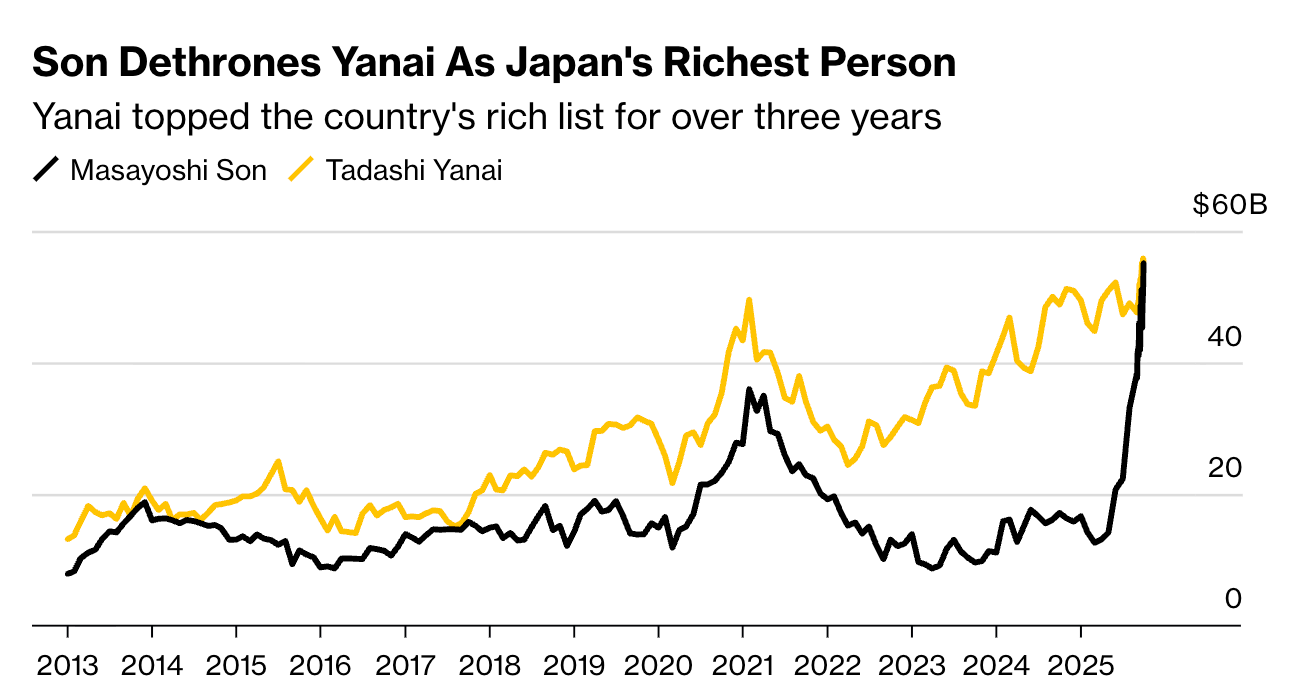 凤凰网科技讯 北京时间10月30日,据彭博社报道,软银创始人孙正义(Masayoshi Son)在AI领域的重磅押注获得了回报,他的财富现在超越了优衣库创始人柳井正(Tadashi Yanai),成为日本新首富。