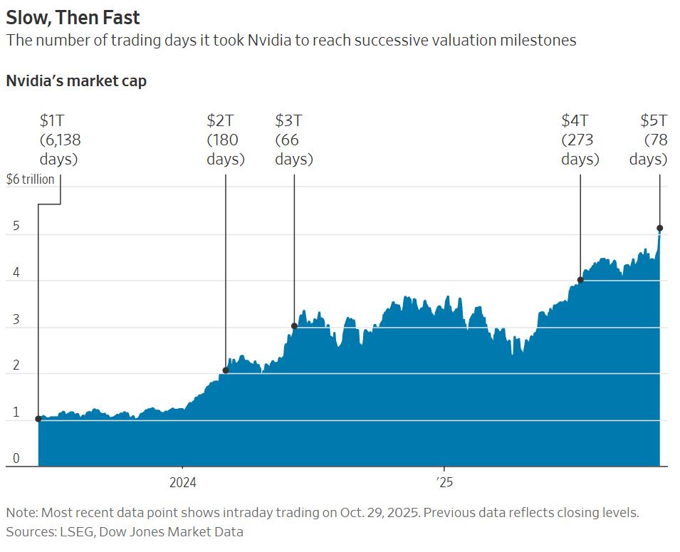 截至10月24日,当时英伟达市值4.5万亿,5天后,英伟达成为蓝星上第一个市值突破5万亿的公司!
