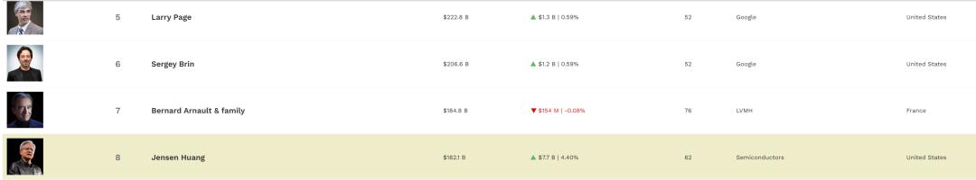 黄仁勋持有大约3%的英伟达股份,净资产估计为1744亿美元,使他成为全球第八富有的人。